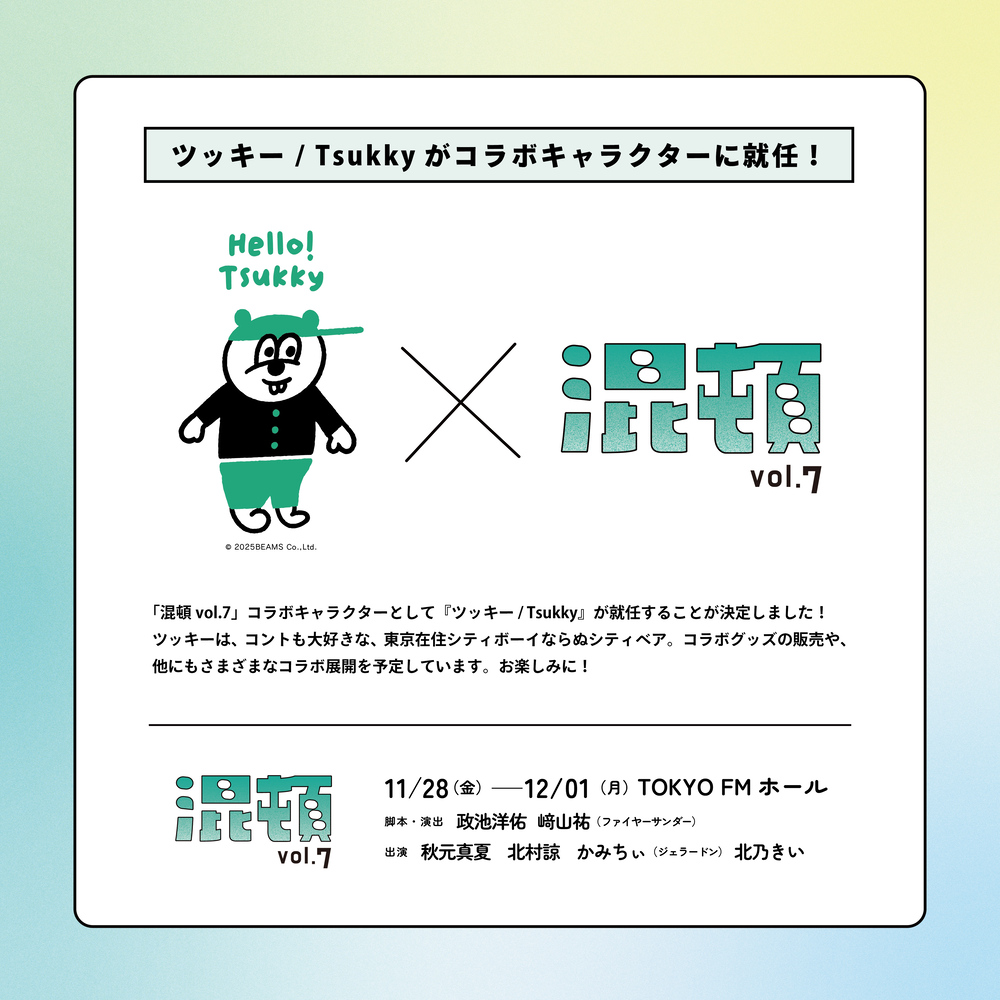 「混頓 vol.7」コラボキャラクターとして『ツッキー / Tsukky』が就任することが決定しました!ツッキーは、コントも大好きな、東京在住のシティーボーイならぬシティベア。コラボグッズの販売や、他にも様々なコラボ展開を予定しています。お楽しみに!